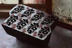 Designs are known by their names such as mountain design, dol design and kite design. Dots are used to make up the designs. A different colour on either side is also practiced by the craftsmen.