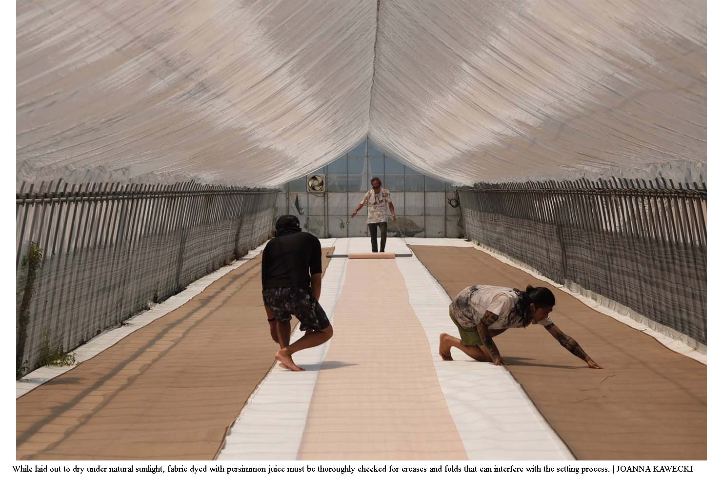 Higashiomi, Shiga Pref. – On a hot summer day in July, it’s nearly 45 degrees Celsius inside this greenhouse in Shiga Prefecture. Along with the humidity, though, there’s another type of moisture in the air: the deep burnt orange of kakishibu (persimmon juice) setting into the threads of 30-meter lengths of fabric laid out to dry.