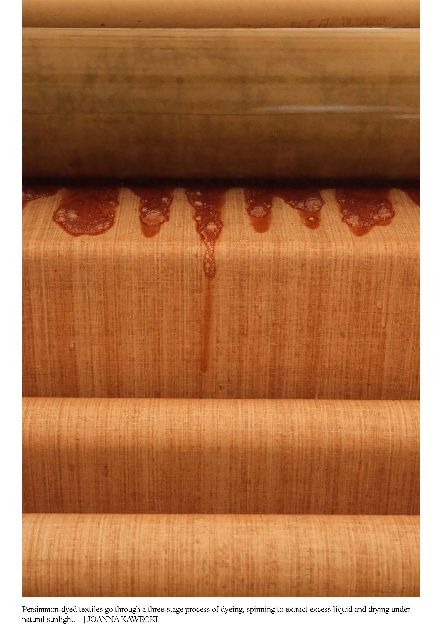 Persimmon tannin-dyed textiles are created through a three-stage process of dyeing, spinning and drying. Depending on the desired color and depth, the cycle can be repeated up to three times. Any excess liquid, extracted by a large, stainless steel spinning machine, can be reused over and over, and the textile is dried in large greenhouses, where abundant, natural light can activate the tannins while protecting it from wind, animals and insects.