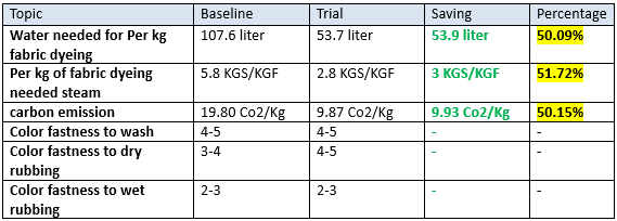 Table-3.3.1: Differences breakdown between baseline and trial dyeing process