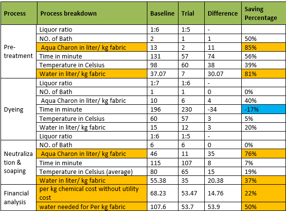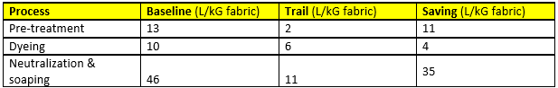 The soaping agent having 2.4-3.1 pH neutralizes the dye bath and also removes the unfix dyes well. So, few baths were also omitted in after-treatment. Besides, eliminating unnecessary aquachron and conducting block washes instead a huge amount of water was saved. This overall process of dyeing also minimizes the steam usage 51.72% less as the water was consumed less. This process is also responsible for 50.15% less carbon emission than before. The sample fabric also retained the required fastness property and all other required quality parameters.