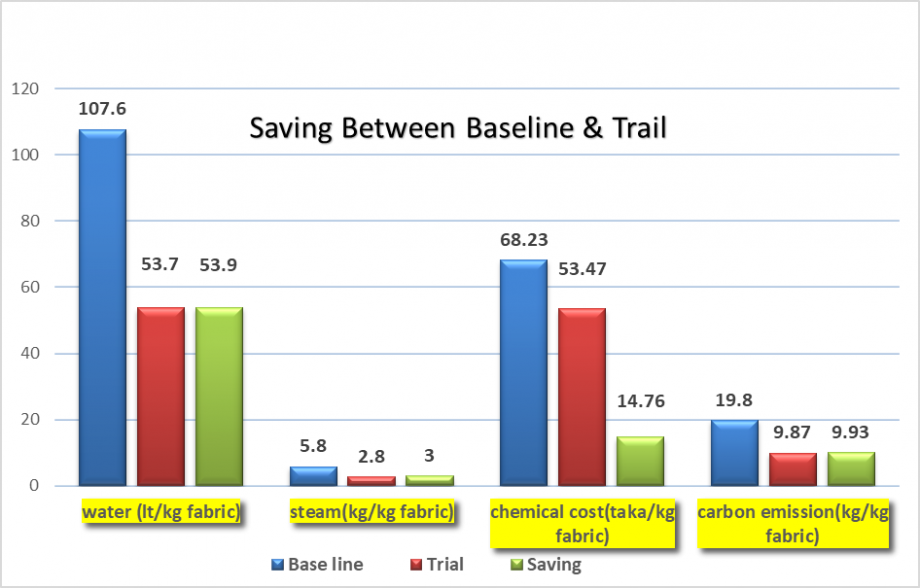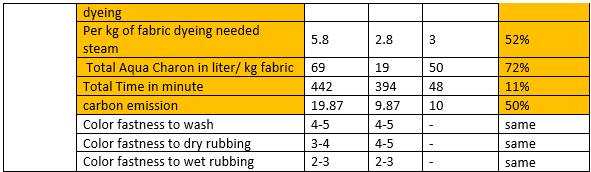The dark colors including black color are dyed about 45% of total capacity of monthly dyeing which is about 337.5 ton out of 750 tons. By implementing this process water will be saved about 18,191.25 m3. That means we can reduce the cost of water processing at ETP by 4,54,781.25 TK monthly and 54,57,375 TK yearly (considering 1 m3 water processing at ETP will cost 25 taka). Steam will be saved near about the value of 5,41,89,000 taka yearly ( considering 1 kg steam generating cost is 4.46 TK). Chemical cost will be saved by 597,78,000 TK annually.