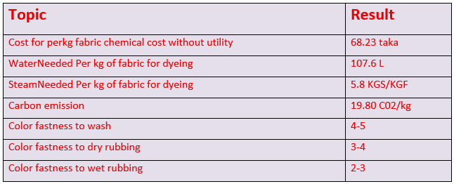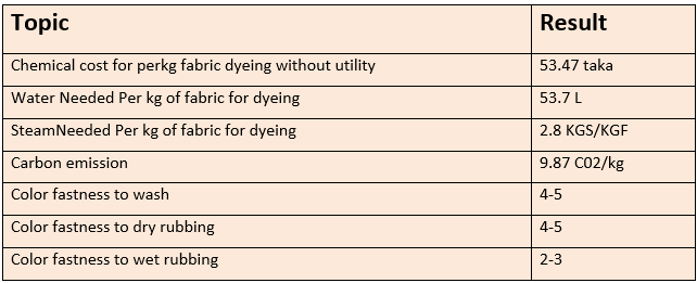 After the newly developed dyeing technique is has been found that water consumption has been reduced to 50.09% than before mentioned in standard baseline. The steam required was saved 51.72%. The cost of chemical was saved 21.63% than before and carbon emission was reduced about 50.15%. The sample tested fulfills the standard fastness properties similar to the process of baseline. So the standard quality of dyed fabric was preserved after dyeing in this newly developed process.