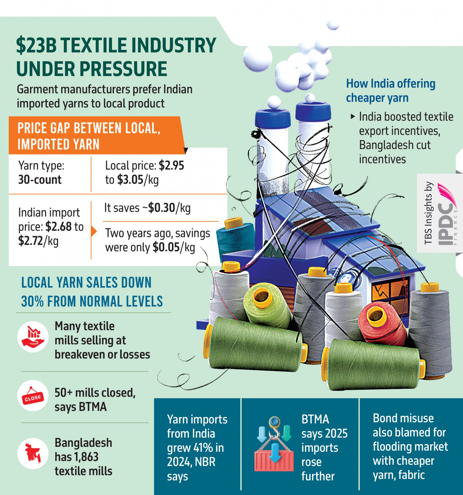 Industry insiders say the price gap between locally produced and imported yarn has widened sharply in recent years, largely due to India's generous export incentives and Bangladesh's declining policy support.