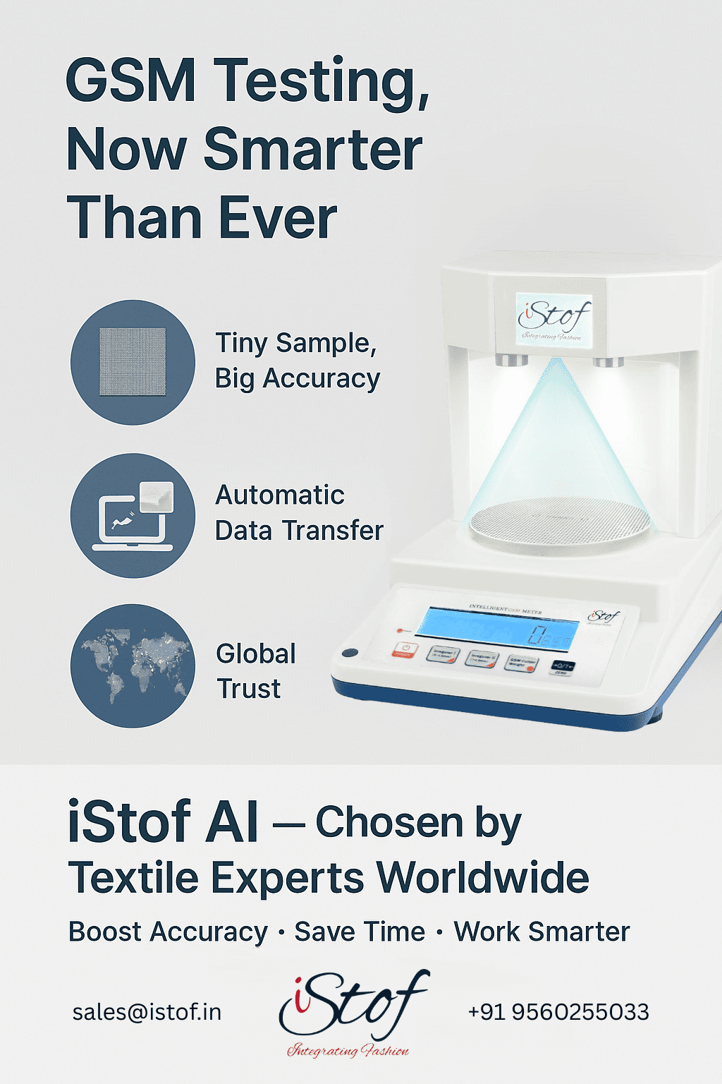 Automatic Data Transfer: Machine can be connected with your system and the GSM test data can be transferred to your system automatically and saved in Excel sheet with the picture of the tested sample. So, you need not to record the data hand written and then transfer to your system.