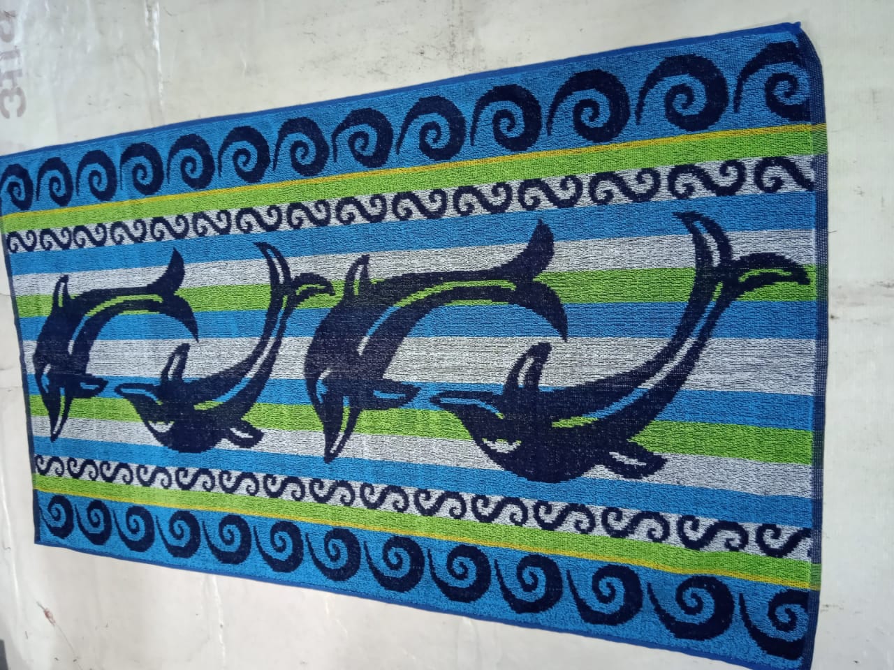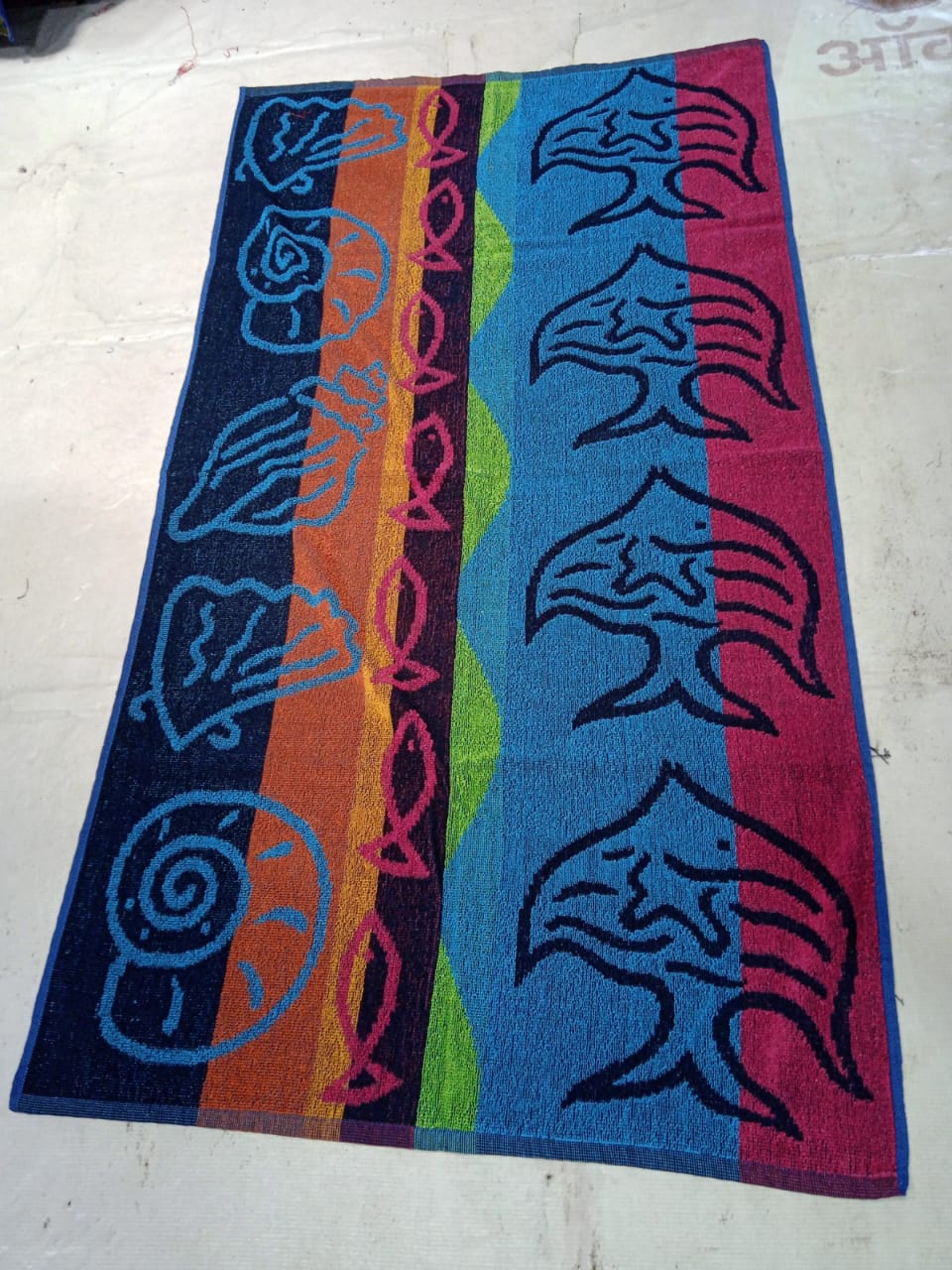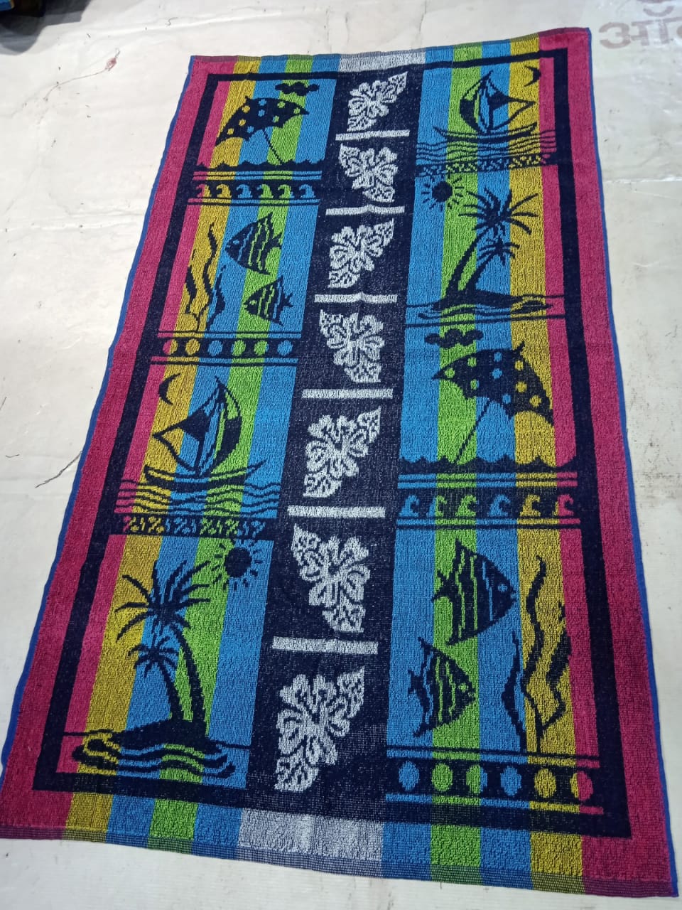 High-quality Powerloom PC Yarn Jacquard Beach Towels, made using a durable polyester-cotton blend for superior strength and softness. The towels feature attractive jacquard designs in assorted patterns, ideal for bulk supply and export.